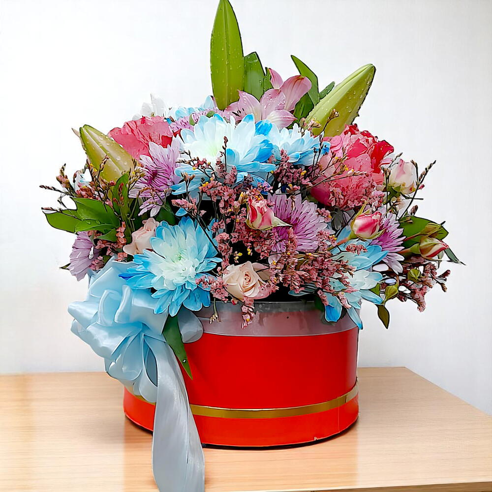 Dispuesto en una vibrante sombrerera roja, este ramo luce una mezcla de azules fríos, rosas suaves y verdes exuberantes—perfecto para hacer una declaración alegre pero elegante. Ideal para celebraciones, baby showers o simplemente para alegrarle el día a alguien, este arreglo se siente como una bocanada de aire fresco primaveral.