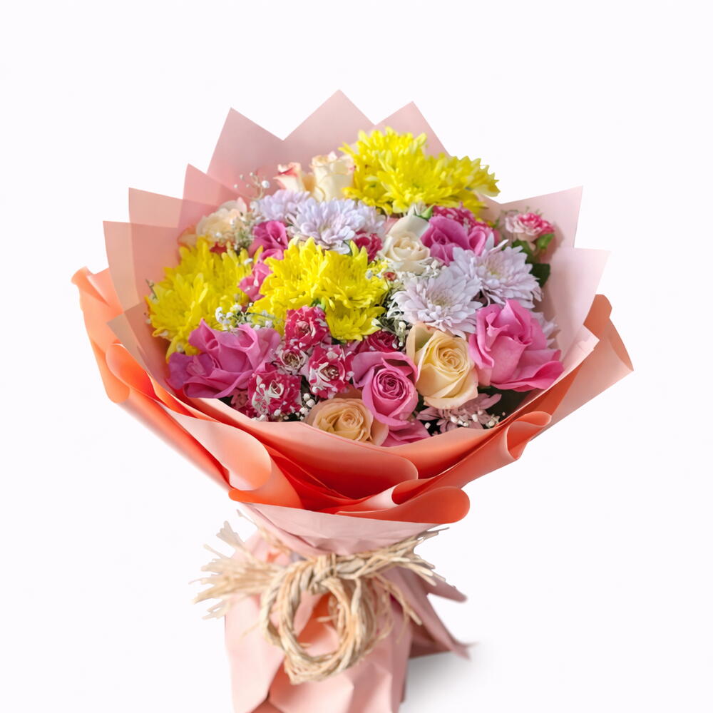 Una encantadora mezcla de rosas rosadas, crisantemos amarillos y morados, rosas miniatura y gypsophila, envuelta en rosa suave.