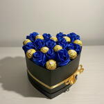 La cinta - 1 ud. caja con forma de corazón - 1 ud. chocolate ferrero rocher - 10 ud. rosa azul teñida - 12 ud.