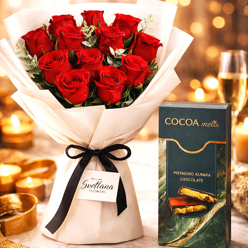Ramo de 12 rosas rojas bellamente envuelto, acompañado de chocolate premium de pistacho, un regalo perfecto para San Valentín lleno de romance y placer.