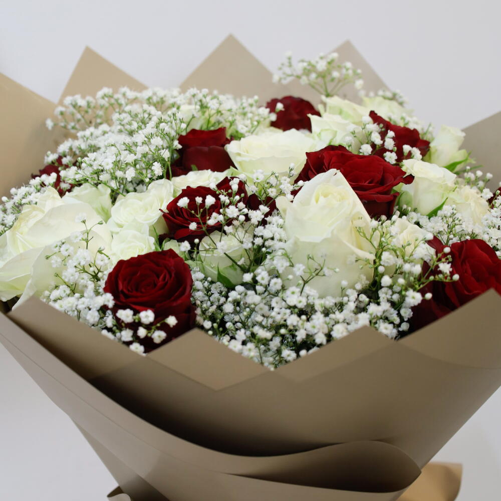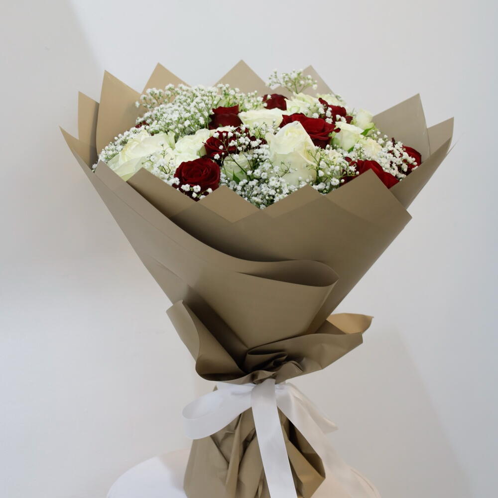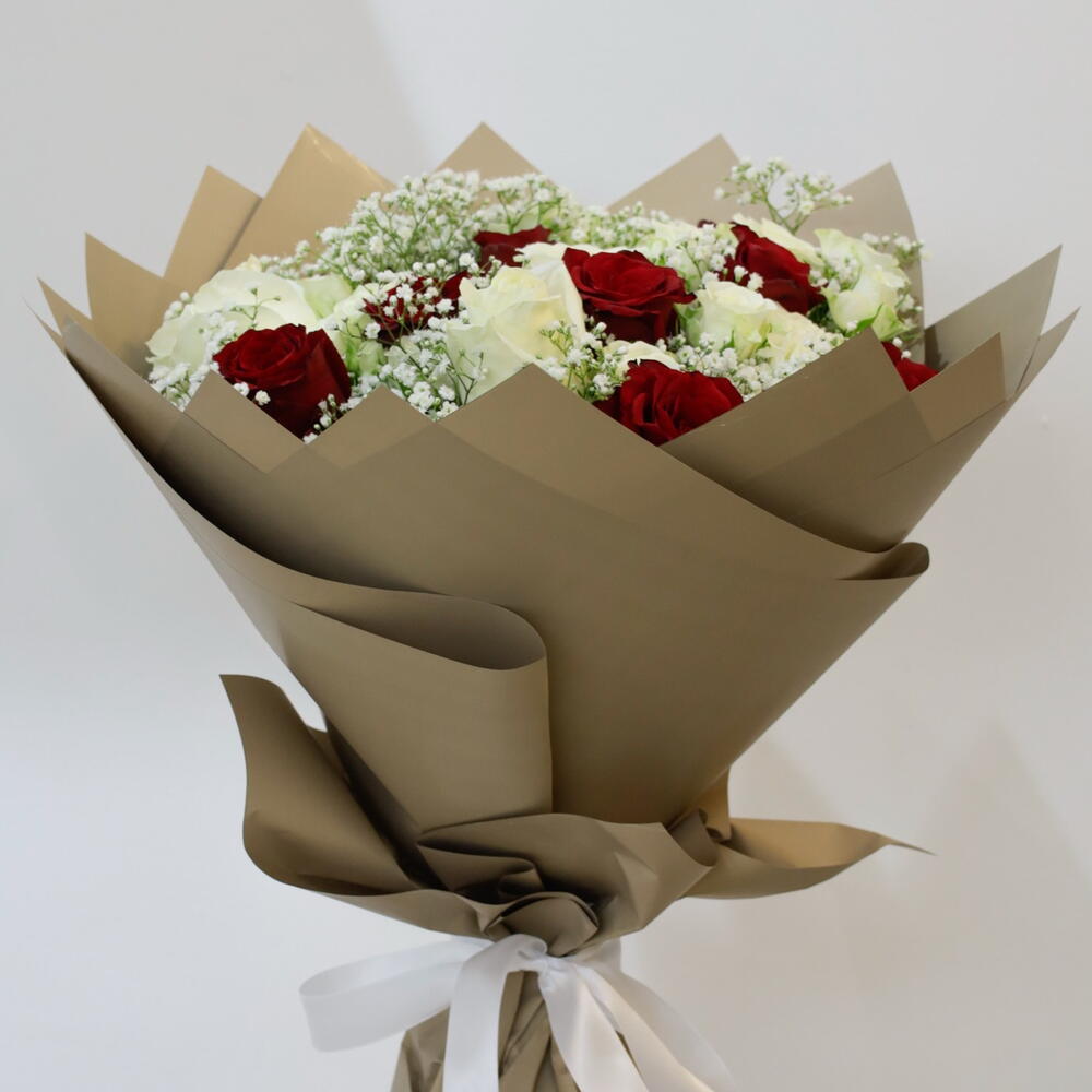 Red rose - 15 ud. White rose - 15 ud. gipsofila blanca - 5 ud. papel de regalo marrón - 5 ud.