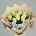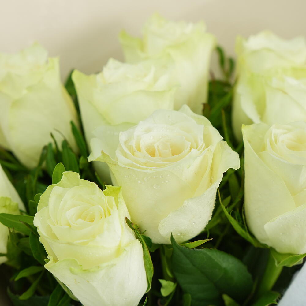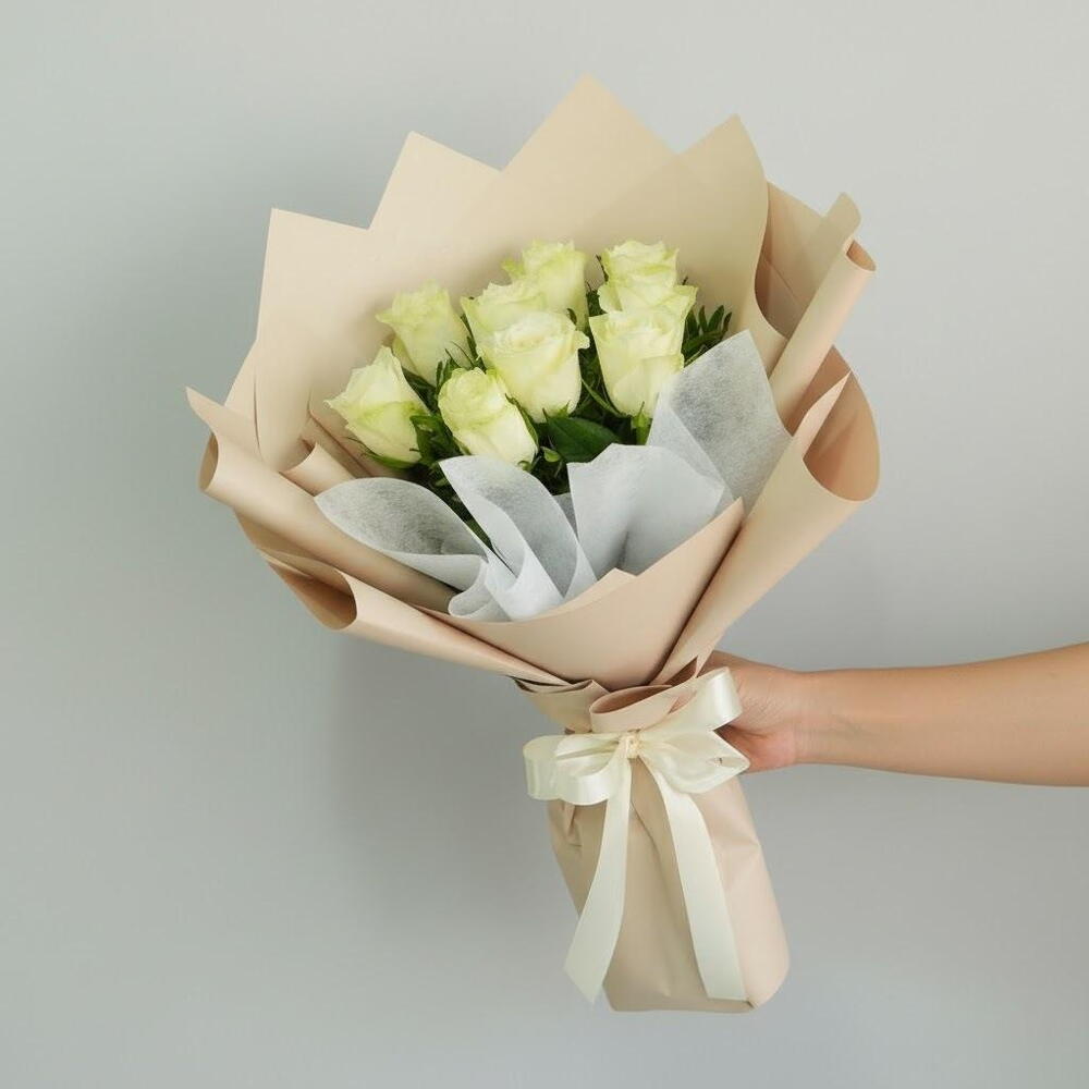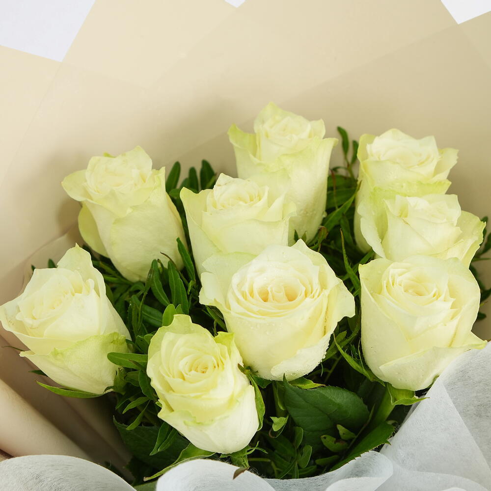 9 rosas blancas frescas envueltas en un elegante envoltorio neutro. Un ramo clásico para momentos sinceros y llenos de gracia.