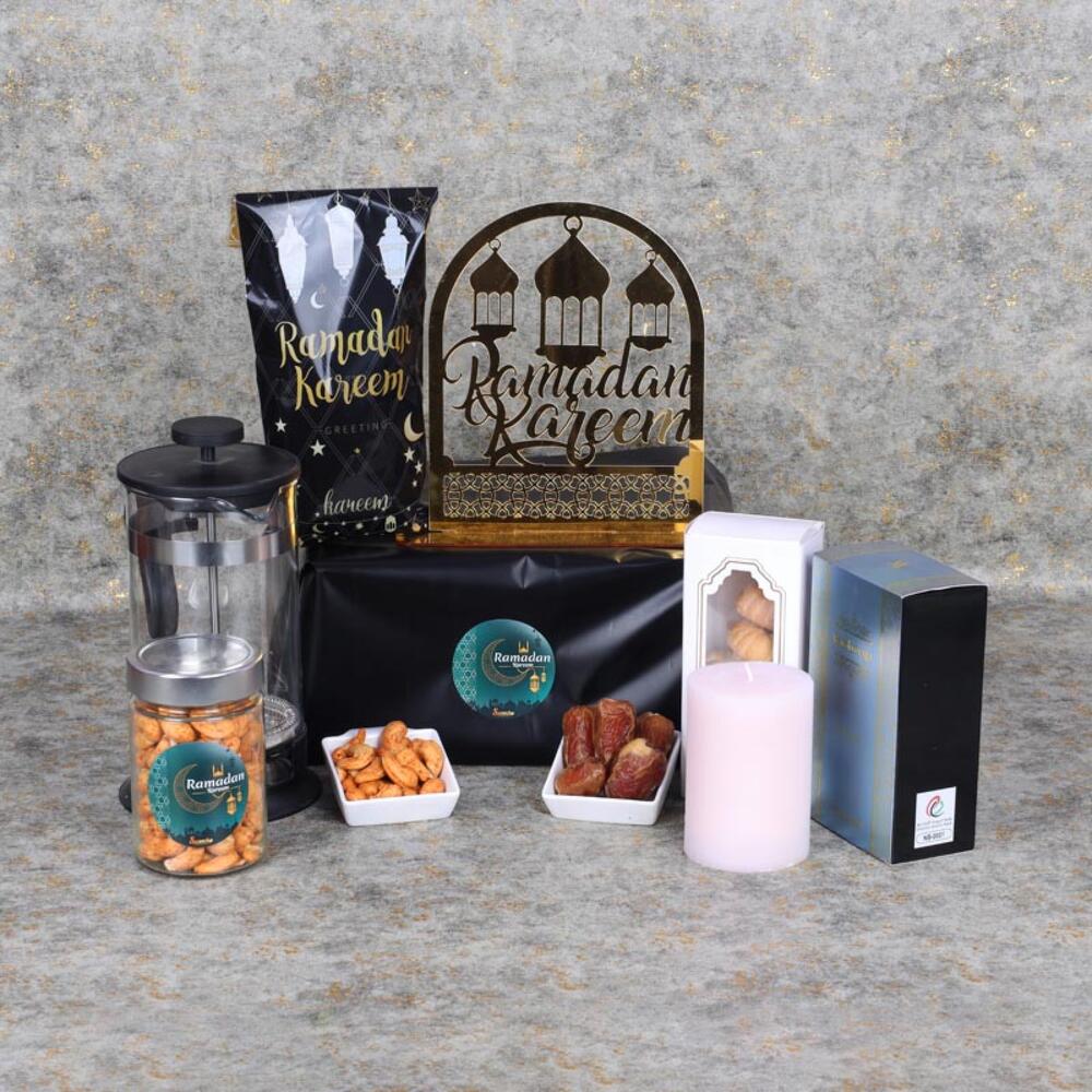 dátiles madjool - 100 gr vela pilar perfumada - 1 ud. anacardos picantes - 150 gr ramadán kareem centro de mesa - 1 ud. swiss arabia perfume árabe surtido - 1 ud. cafetera - 1 ml dátiles mamoul - 5 ud. cesta metálica. - 1 ud.