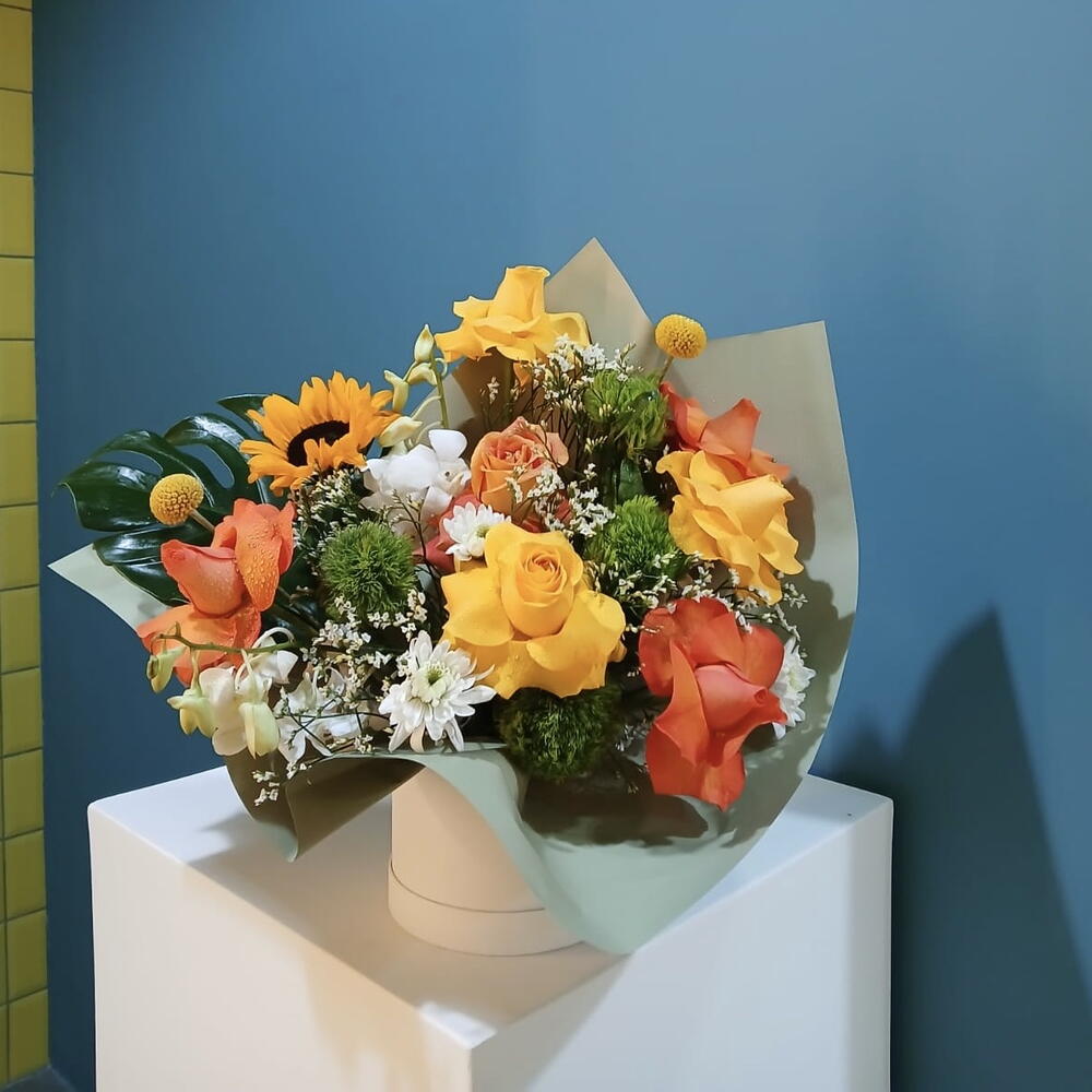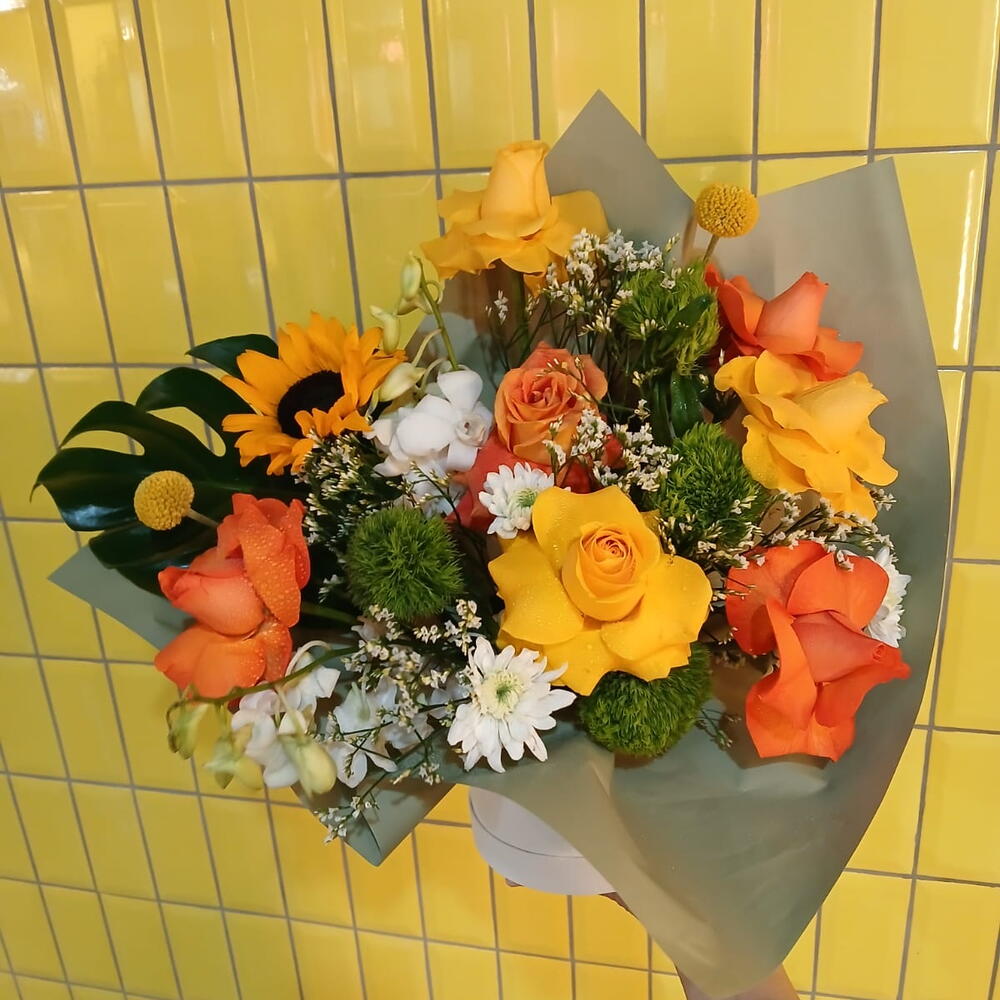 Contempla esta vibrante mezcla, un arreglo Flowers in a Box que irradia alegría y vivacidad. El conjunto selecciona cuidadosamente un crisantemo y un girasol, erguidos, que simbolizan la alegría y la positividad en la vida. Compartiendo el protagonismo se encuentran dos majestuosas orquídeas, cuya belleza infunde asombro. Alrededor de estos protagonistas, nuestros floristas han añadido cuatro claveles verdes y cuatro rosas naranjas para un toque refrescante. Tres rosas amarillas y dos delicadas piezas de caspedia aportan una delicada inocencia al ramo. Para establecer una base sólida, se incluye una ancha hoja de monstera verde, haciendo que los colores vibrantes resalten. Esta mezcla floral seguramente enamorará con su combinación única de color, fragancia y encanto.