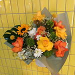 El crisantemo - 1 ud. Sunflower - 1 ud. Orchid - 2 ud. claveles verdes - 4 ud. rosas naranjas - 4 ud. rosas amarillas - 3 ud. caspedia - 2 ud. hoja de monstera — verde - 1 ud.