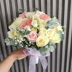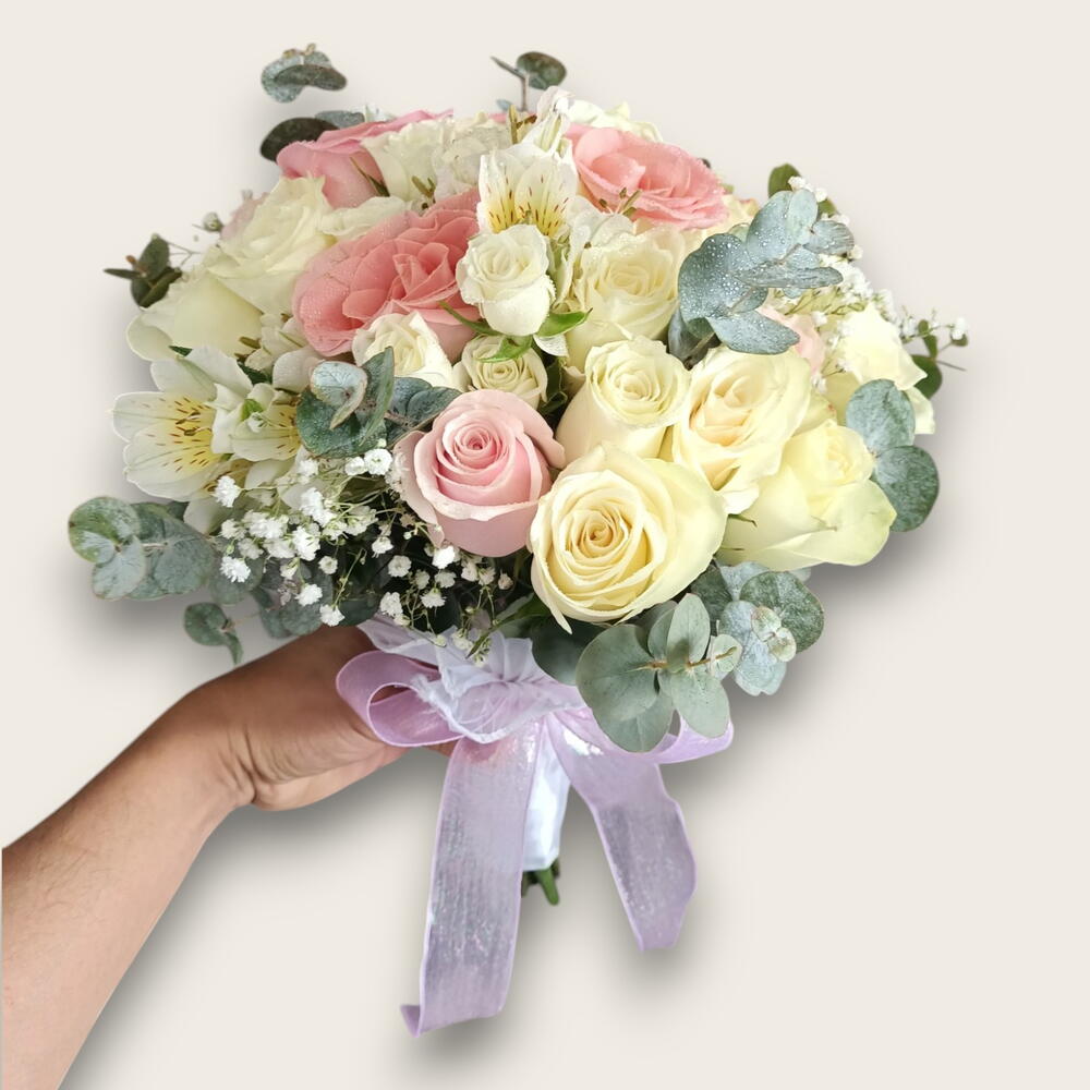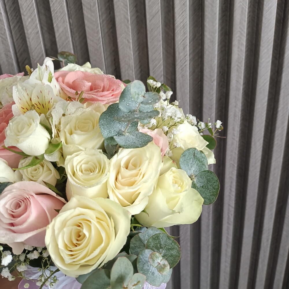 Eucalyptus - 4 ud. Gypsophila - 2 ud. roses - 20 ud. spray roses - 4 ud. estomeria - 3 ud.