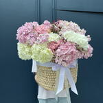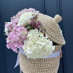 Composición: Hortensia - 14, Chamelacium - 6, Mattiola spray - 3 Tamaños: ANCHO - 60CM; ALTO - 60CM; LARGO - 60CM; (incluido el embalaje) Tamaño: 60 x 60 x 60 cm