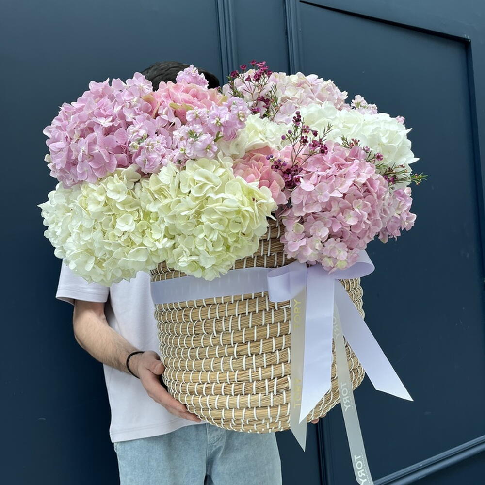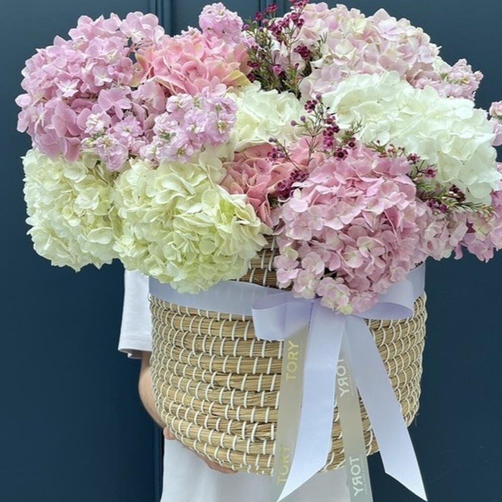 Composición: Hortensia - 14, Chamelacium - 6, Mattiola spray - 3 Tamaños: ANCHO - 60CM; ALTO - 60CM; LARGO - 60CM; (incluido el embalaje) Tamaño: 60 x 60 x 60 cm