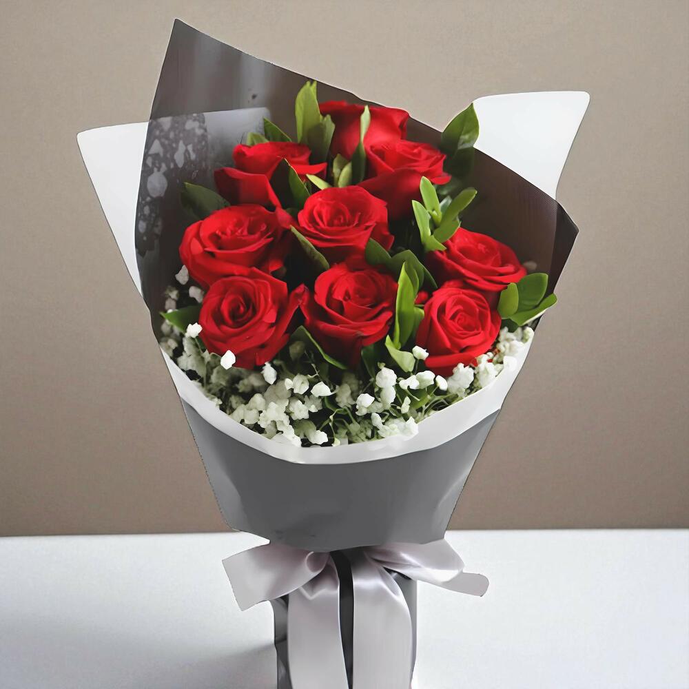 Un cautivador ramo de rosas rojas, perfecto para aportar pasión y sofisticación a cualquier ocasión. -10 rosas rojas -Complementado con flores de relleno -Envuelto en embalaje negro y blanco - Atado con cinta plateada