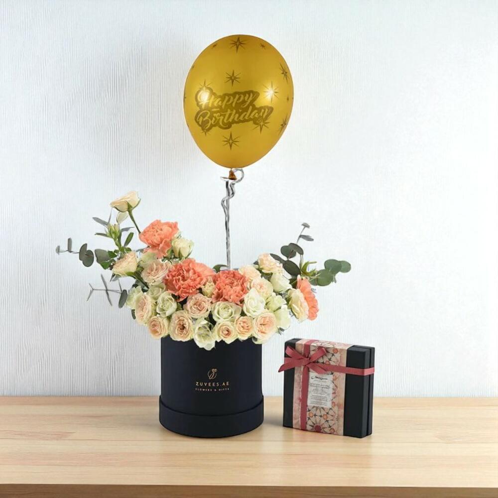 Coral Frost en Negro – Caja de Cumpleaños Bloom con Globo de Chocolate Mirzam