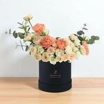 Celebra cumpleaños y momentos especiales con el Combo de Chocolate Bloom Box de Cumpleaños Coral Frost en Negro: un sofisticado arreglo floral que combina la elegancia moderna con un capricho gourmet. Diseñada en una llamativa caja redonda negra, esta radiante mezcla de rosas color melocotón, claveles color coral anaranjado y rosas en spray está acentuada con fragante eucalipto y se complementa con una deliciosa barra de chocolate Mirzam y un festivo globo dorado de cumpleaños. Perfecta para cumpleaños, sorpresas románticas o regalos de lujo que dejan una impresión imborrable. Instrucciones de cuidado Coloca la caja Bloom en un lugar fresco y sombreado, alejado de la luz solar y las corrientes de aire. Riega ligeramente la espuma floral cada 1 o 2 días para mantener las flores hidratadas, pero no la riegues en exceso para conservar la integridad de la caja. Conserva el chocolate en un lugar seco y fresco. El globo se exhibe mejor en interiores, lejos de objetos afilados y fuentes de calor.