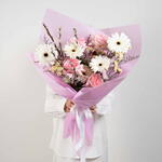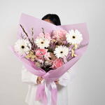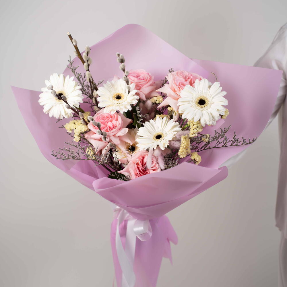 sauce cabrío - 4 ud. ohara rosa - 4 ud. limonium purple - 2 ud. gerbera blanca - 5 ud. statice amarillo - 2 ud. phalaris seco - 3 ud.