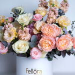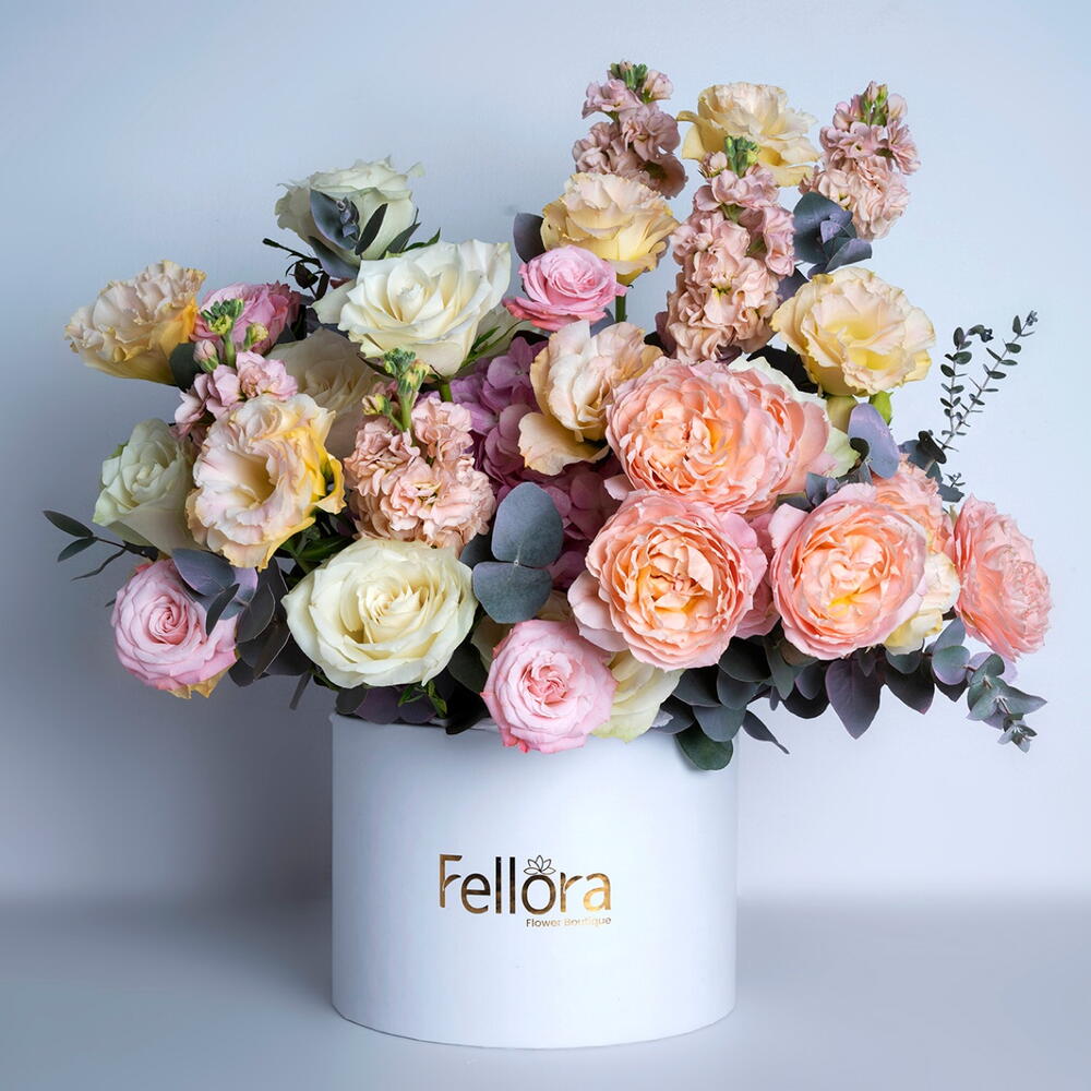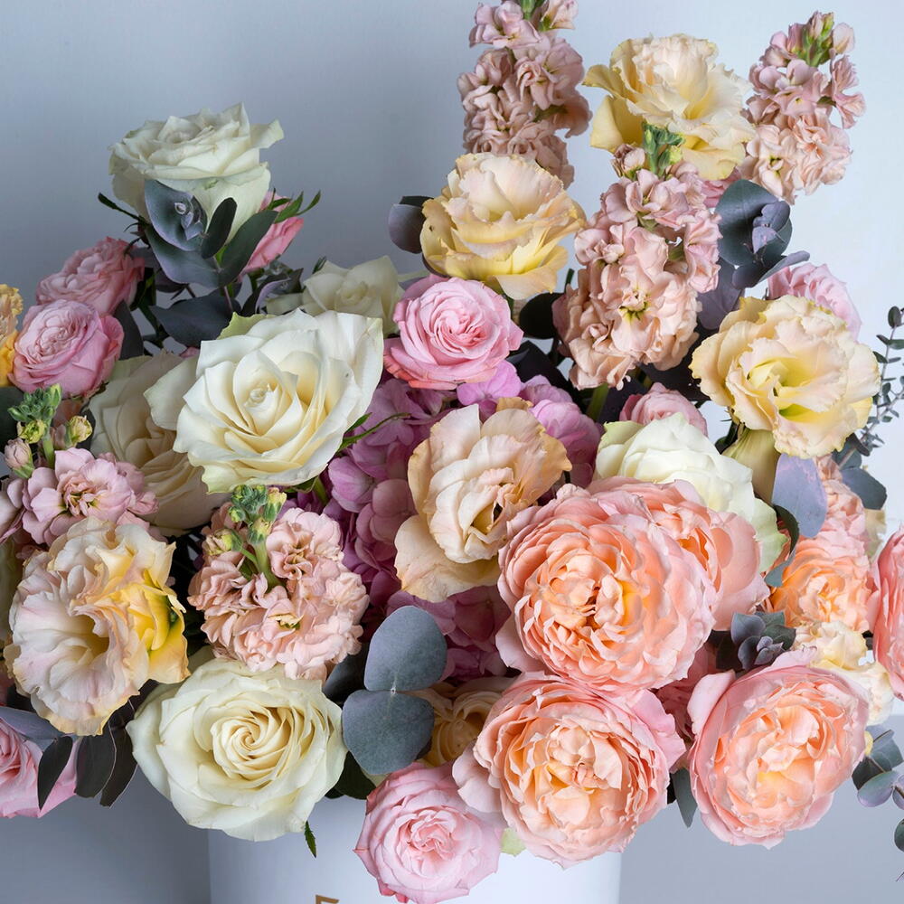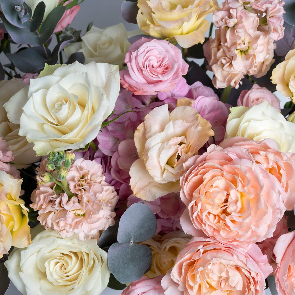 White rose - 15 ud. hydrangea pink - 1 ud. eustoma melocotón - 5 ud. bombastic spray rose - 5 ud. eucalyptus leaves - 5 ud. julieta premium rosa - 4 ud. mathiola 5 - 5 ud.