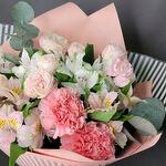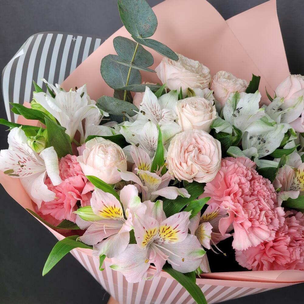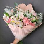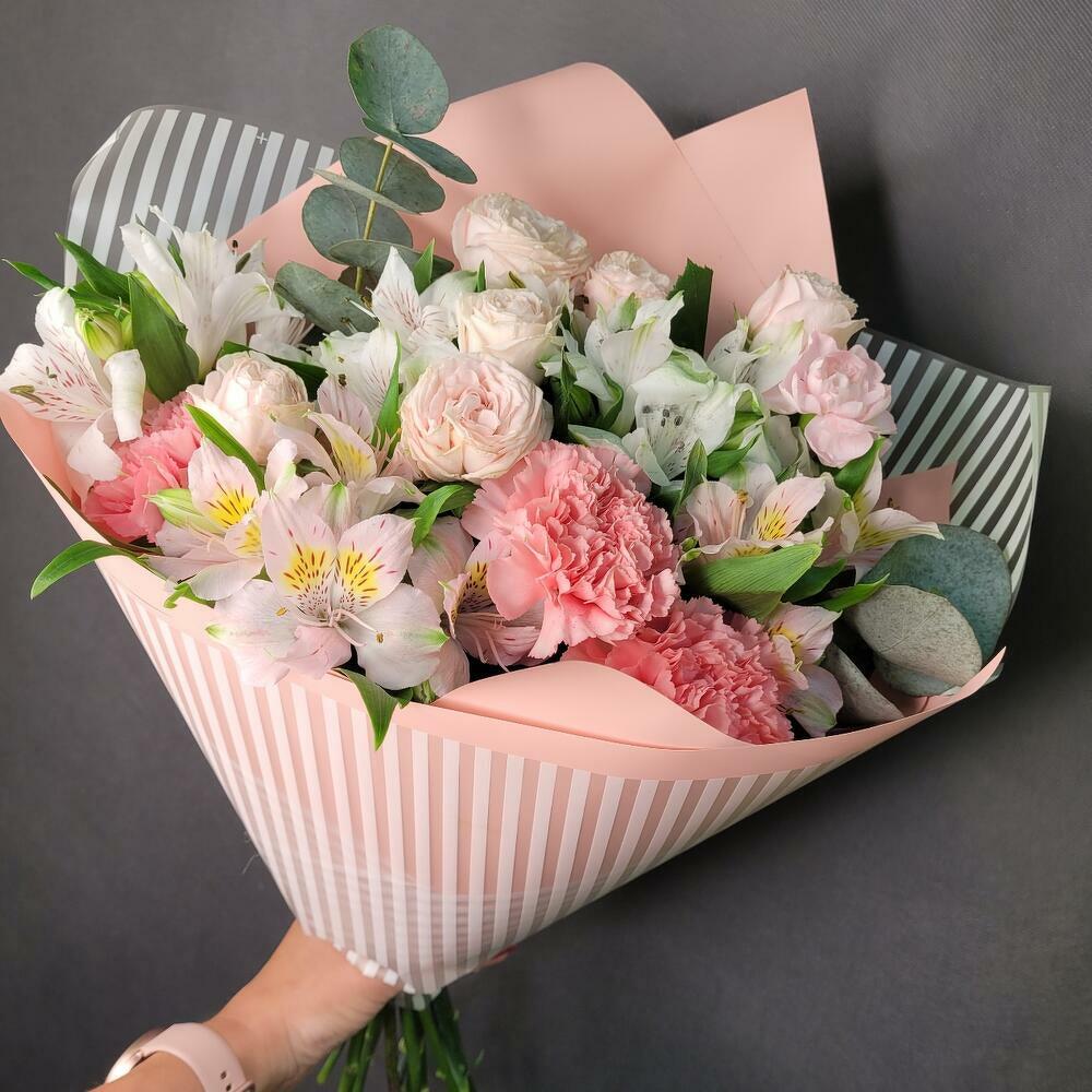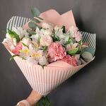 Satin ribbon - 1 ud. Eucalyptus - 1 ud. Spray rose - 2 ud. Alstroemeria - 5 ud. dianthus - 3 ud. designer wrapping - 1 ud.