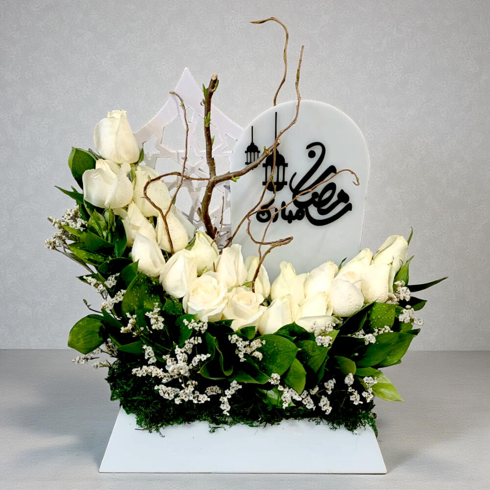 Una majestuosa y espiritual composición floral diseñada para el Ramadán, con un elegante arreglo en forma de media luna de rosas blancas inmaculadas. El diseño se presenta sobre un fondo de intrincada geometría islámica y una placa acrílica personalizada con el saludo Ramadan Mubarak y motivos de linternas. Acentuada con frondosa vegetación verde, delicados rellenos blancos y ramas secas naturales, esta pieza sirve como un hermoso centro de mesa para reuniones bendecidas.