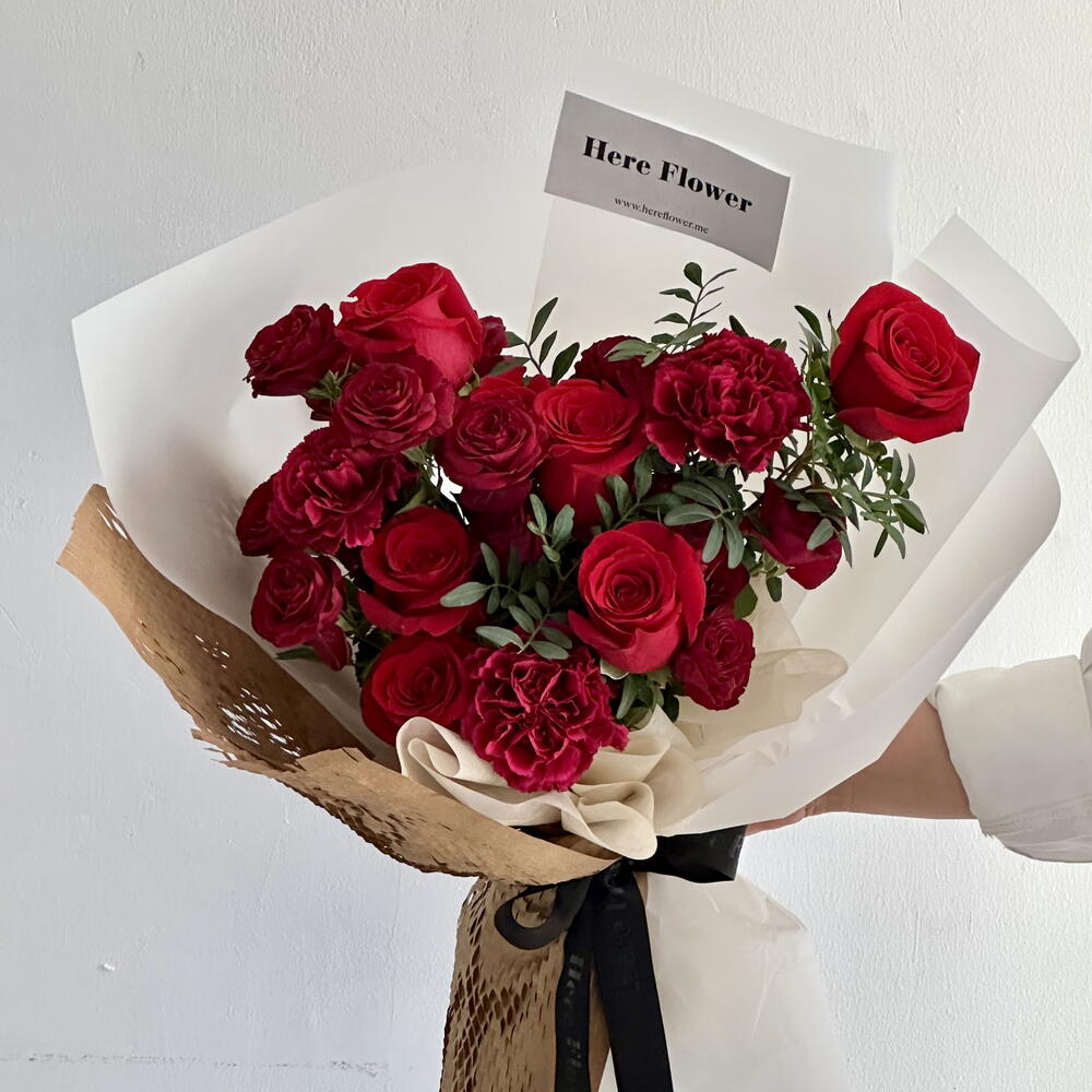 Este cautivador ramo presenta Rosas Ever Red combinadas con vibrantes claveles rojos y acentuadas por delicadas rosas spray rojas. Frondosas hojas de pistacia aportan un toque de frescura, todo elegantemente envuelto en una armoniosa mezcla de blanco y marrón.
