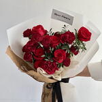 Red rose - 7 ud. Spray rose - 3 ud. hojas de pistacho - 3 ud. flor de clavel - 3 ud.