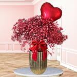 Arreglo en jarrón dorado con gypsophila roja y un globo metálico rojo en forma de corazón es la sorpresa perfecta para San Valentín