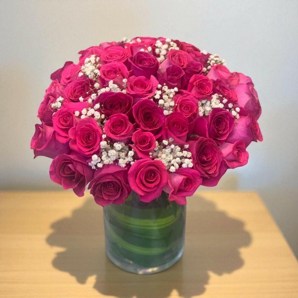 51 ROSAS DE COLOR ROSA OSCURO EN UN JARRÓN DE CRISTAL 550 AED