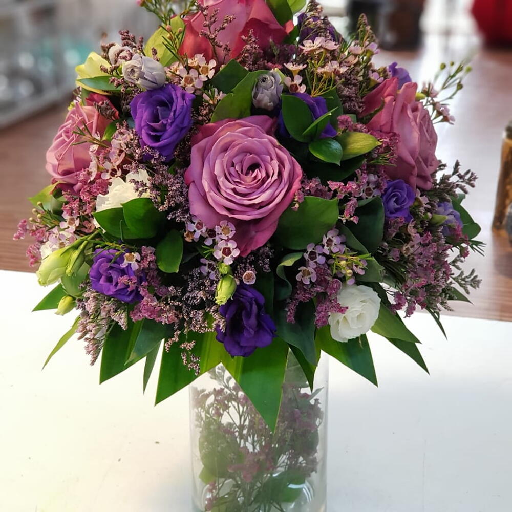 Wax flowers - 2 ud. astoma - 4 ud. rosas moradas - 7 ud. lisianthus blanco - 3 ud.