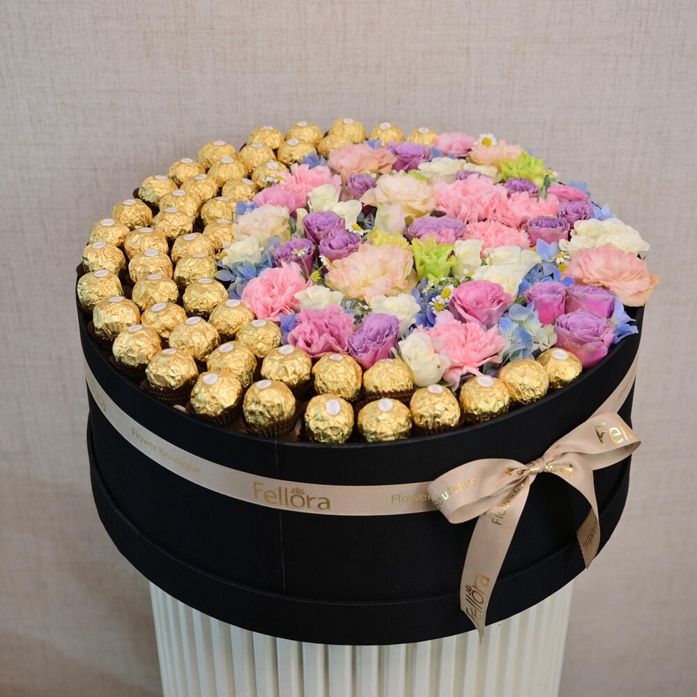 Esta creación presenta 48 chocolates Ferrero Rocher dispuestos en forma de luna creciente, complementada por 5 claveles, 2 eustoma, 4 rosas spray, 2 tanacetum y 1 hortensia en una elegante caja redonda negra.