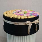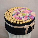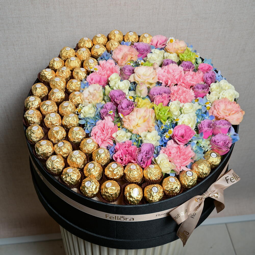 La cinta - 1 ud. Eustoma - 2 ud. Hydrangea - 1 ud. Ferrero rocher - 48 ud. flower box - 1 ud. carnation - 5 ud. tanacetum - 2 ud. spray roses - 4 ud.