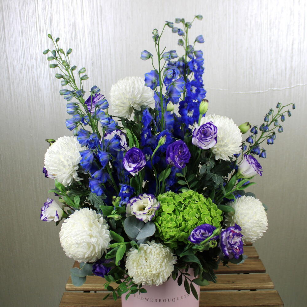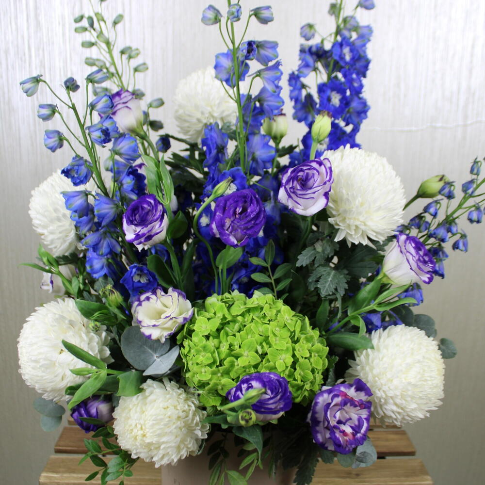 Crisantemo blanco - 6 ud. hortensia verde - 1 ud. delphinium azul - 5 ud. hoja de pistacho - 5 ud. eustoma azul - 8 ud.