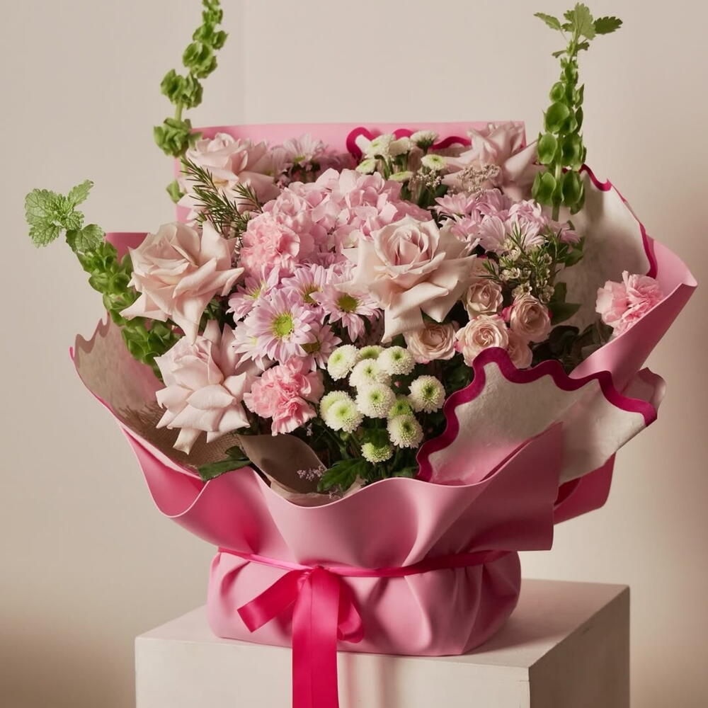 Te presentamos el ramo perfecto para chicas dulces, soñadoras y peligrosamente románticas. Es rosa, preciosa, tiene un aroma a protagonista de novela romántica y, sinceramente… está convencida de que tu relación sin compromiso se formalizará después de verla. Rosas rosa pálido, hortensias rosa bebé, crisantemos delicados, ramitas de menta y ese alto tallo de campanillas de Irlanda que irradia una energía de superioridad: este ramo es, literalmente, la versión pastel de una reina soñadora. Es para la chica que: ✨ Crea tableros de Pinterest para relaciones que no existen ✨ Se enamora con solo mirar a los ojos ✨ Cree que cada cielo rosa es una señal del universo ✨ Cree que merece flores "porque sí" (¡y tiene razón!) Si tu época es soñadora pero adorable, este ramo es tu alma gemela. Suave, dulce, un poco irrealista, pero con la estética más exquisita.