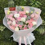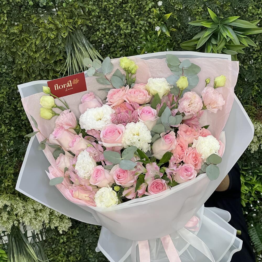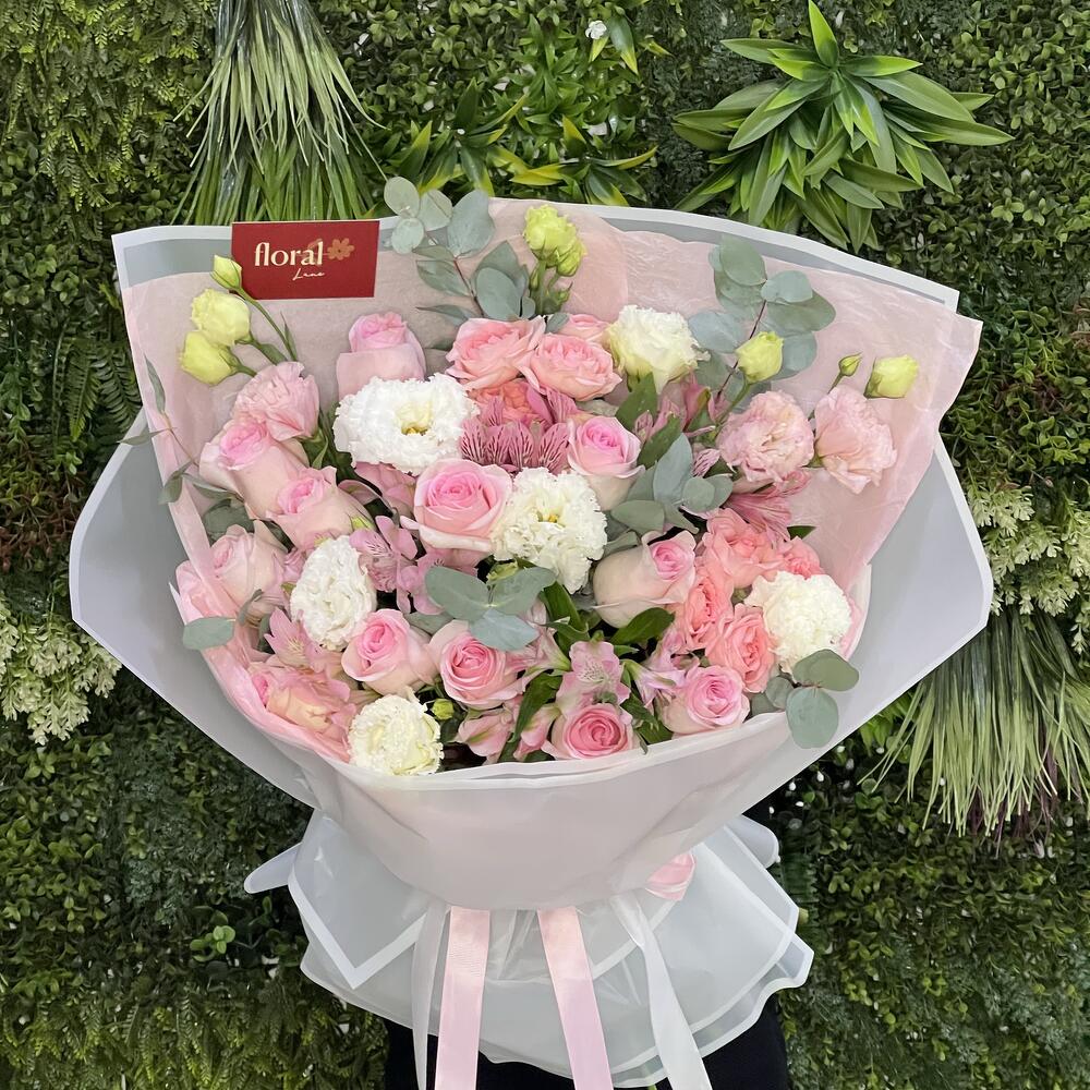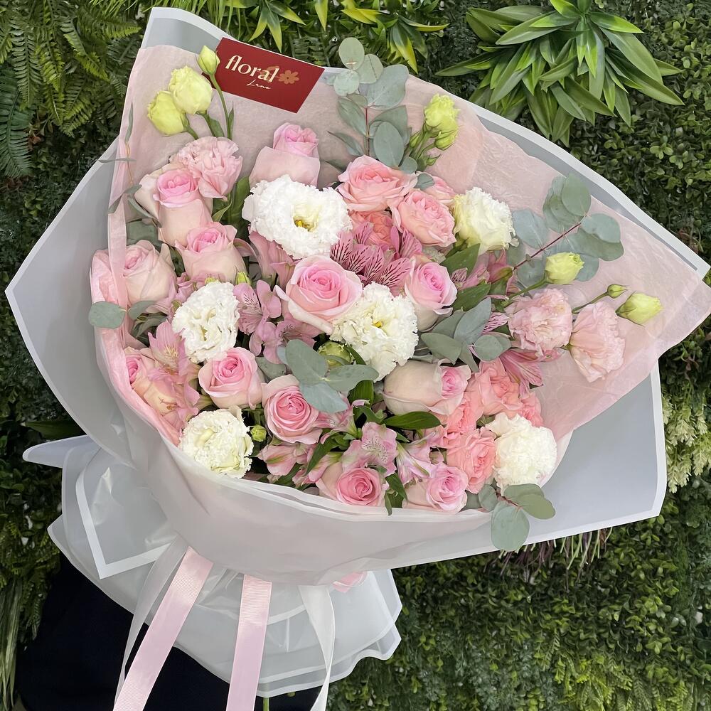 white lisianthus - 4 ud. lisianthus rosa - 2 ud. eucalipto - 2 ud. alstroemerias rosas - 5 ud. rosas en aerosol sweet sara - 2 ud. pink roses - 10 ud.