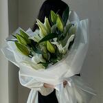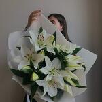 Un ramo de lirios blancos atado con una cinta de satén — clásico y atemporal, perfecto para condolencias o emociones sinceras.