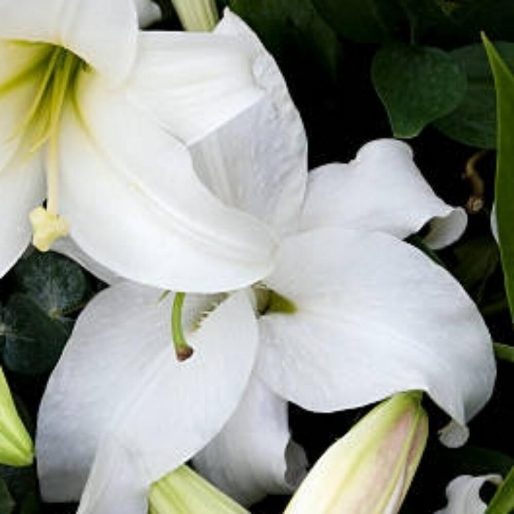 Un ramo de lirios blancos atado con una cinta de satén — clásico y atemporal, perfecto para condolencias o emociones sinceras.