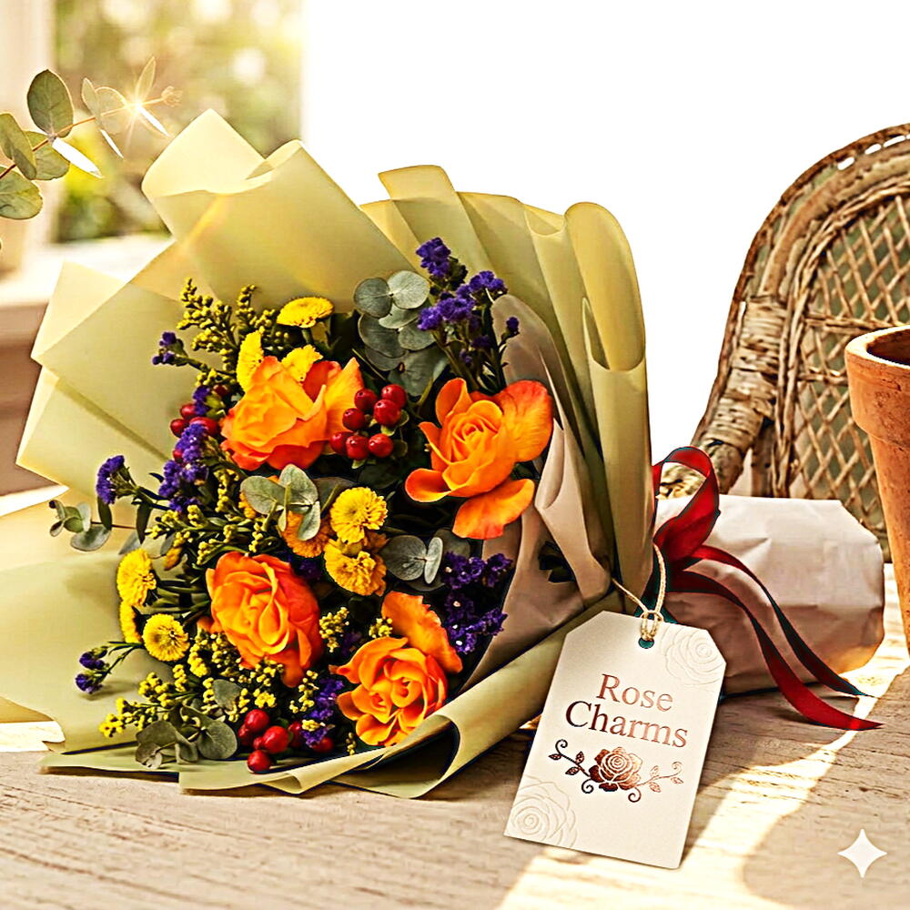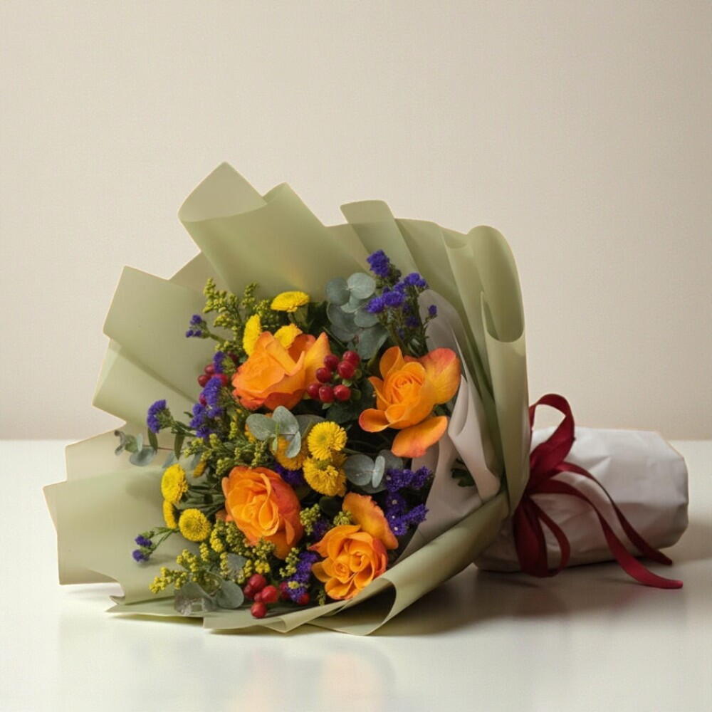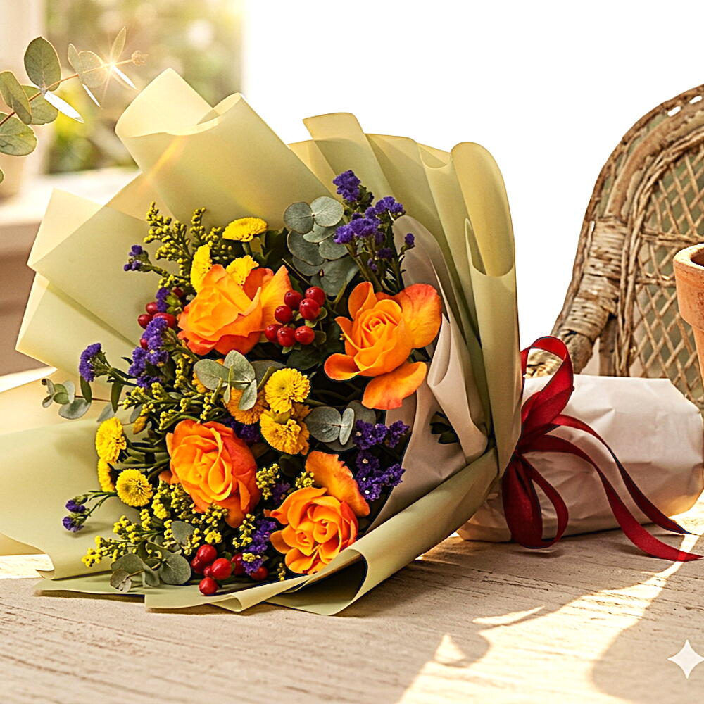 Celebrate life’s vibrant moments with our Radiance Bouquet, a lively and uplifting arrangement featuring 4 orange roses and 3 yellow chrysanthemums, beautifully complemented by fresh seasonal fillers. This radiant bouquet symbolizes joy, prosperity, and happiness, making it a perfect choice for birthdays, celebrations, thank-you gestures, or simply brightening someone’s day. Handcrafted with care, it brings a burst of color and warmth to every home and heart. Share sunshine and smiles — order your Radiance Bouquet today for same-day delivery in Dubai!