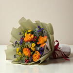 La cinta - 1 ud. Eucalyptus - 5 ud. Wrapping - 4 ud. orange rose - 4 ud. crisantemos amarillos - 3 ud.