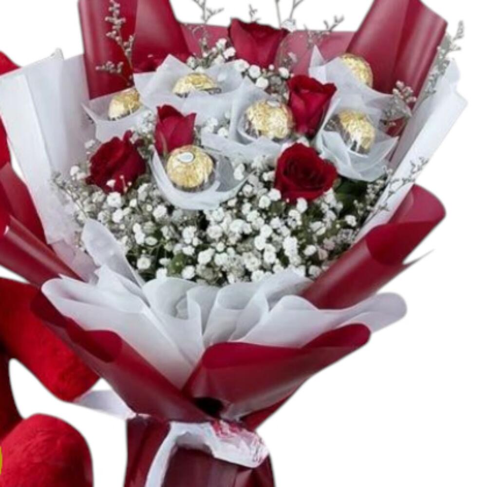 gipsofila blanca - 20 ud. ferrero rocher chocolates - 5 ud. oso de peluche rojo - 1 ud. red roses - 8 ud. pastel de chocolate (0.5 kg) - 1 ud. adorno acrílico para Diwali - 1 ud.