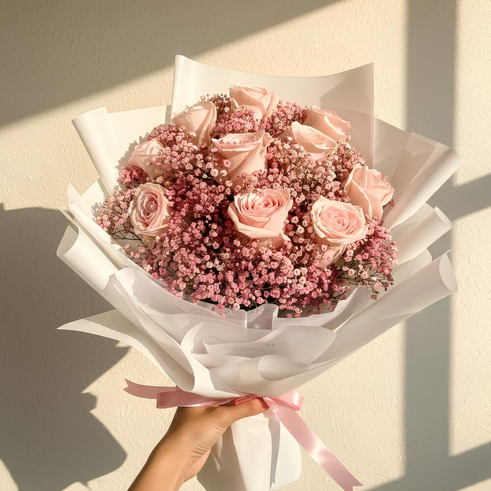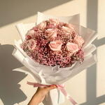 El ramo más encantador, hecho con giselosis rosa rubor y rosas rosa pastel. 10 rosas rosa claro con un ramo de giselosis, envueltas en papel blanco y atadas con un lazo rosa pastel.