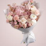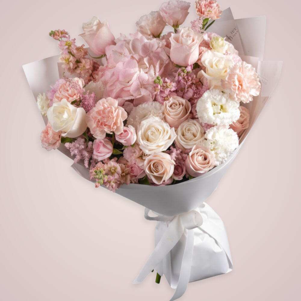 Disfruta del encanto de nuestro Especial del Florista: un encantador ramo que combina la suave elegancia de 1 hortensia rosa, 5 fragantes claveles color melocotón, 5 rosas color crema y 3 delicadas matthiolas rosadas. El arreglo se complementa suavemente con 2 pequeñas rositas rosadas, creando una imagen de delicada sofisticación. Una elección perfecta para cualquier ocasión que requiera algo extra especial.