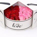 An unforgettable expression of passion and romance, this stunning arrangement features 21–25 premium Red and Pink Roses elegantly arranged inside our signature “With Love” Surprise Box. As the box opens, it reveals a breathtaking harmony of deep crimson and soft blush blooms — symbolizing love, admiration, and heartfelt affection. Each rose is hand-selected for its vibrant color, velvety texture, and exceptional freshness, carefully arranged to create a full, perfectly rounded presentation. The sleek, modern box design enhances the dramatic reveal, making it a memorable gift for anniversaries, birthdays, proposals, Valentine’s Day, or simply to say “you are deeply loved.”
