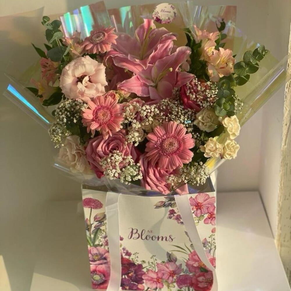 Alstroemeria - 4 ud. Lily - 1 ud. Gerbera - 3 ud. Gypsophila - 5 ud. rose - 10 ud. carnation - 3 ud.