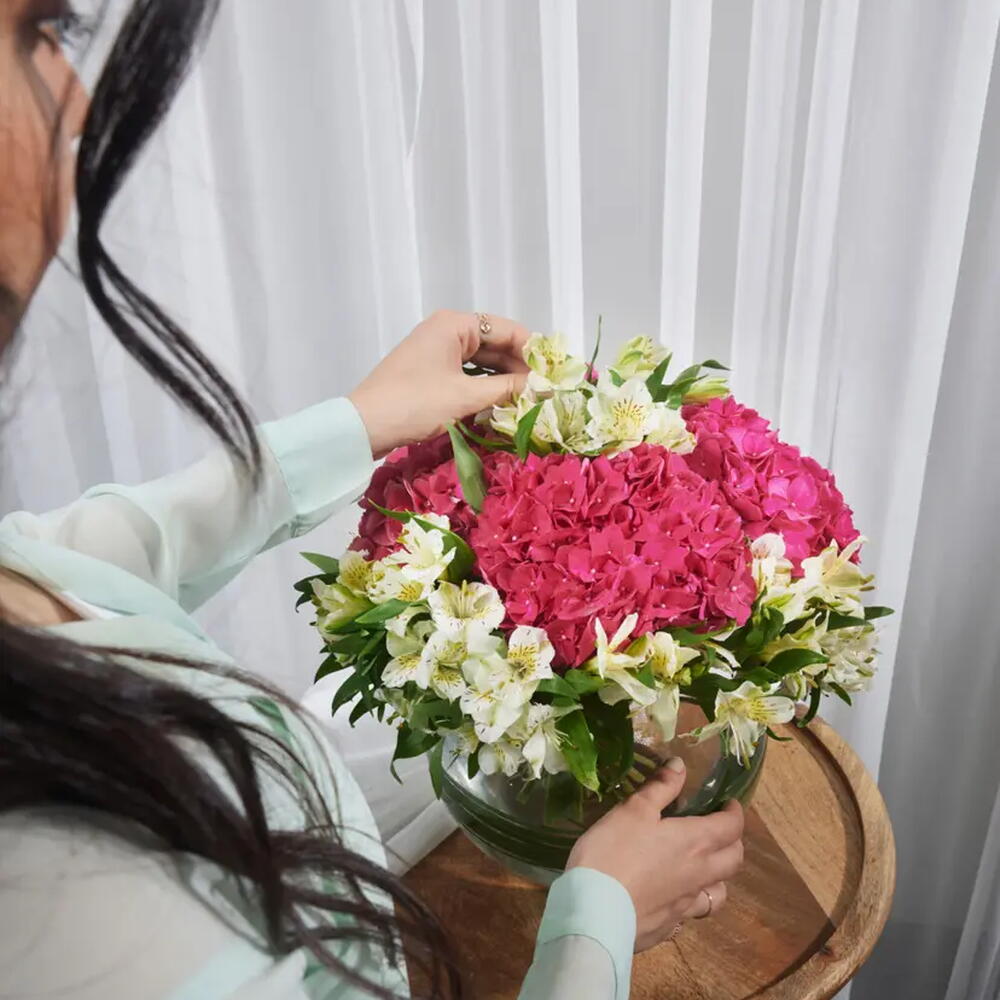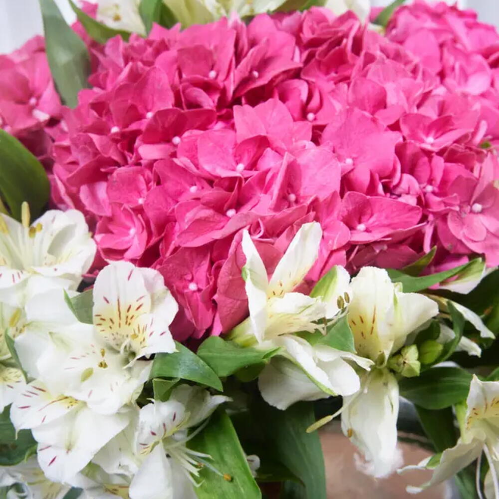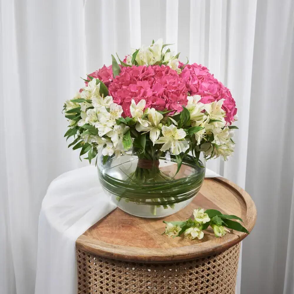 Este extraordinario jarrón de hortensias cautiva la vista y conmueve el corazón. Con alstroemerias blancas y hortensias rosas, armonizan en un arreglo impresionante que cuenta una historia de sentimientos sinceros y momentos de ensueño. Este jarrón no es solo flores; es una obra de arte llena de luz, bellamente dispuesta dentro de un jarrón de vidrio que realza su elegancia. Cada flor captura la esencia de la gracia, añadiendo un toque de lujo y distinción a cualquier ocasión. Deja que esta obra maestra floral sea tu próximo regalo, brindando a quienes amas una sensación inolvidable. Haz tu pedido ahora y dilo con pasión.