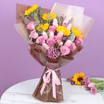 5 girasoles, 10 tulipanes rosa, 10 rosas púrpura intenso, 2 tallos de flores de cera rosa, Hojas - eucalipto bebé de 6 tallos, bellamente envuelto en envoltorio marmoleado dorado marrón y blanco roto, atado con cinta rosa.