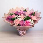 Un encantador ramo que combina rosas rosa pálido, vibrantes crisantemos morados y delicada gypsophila blanca, con toques de follaje verde. Está envuelto en capas de papel rosa claro y rosa oscuro con un sutil ribete dorado y atado con una cinta rosa claro.