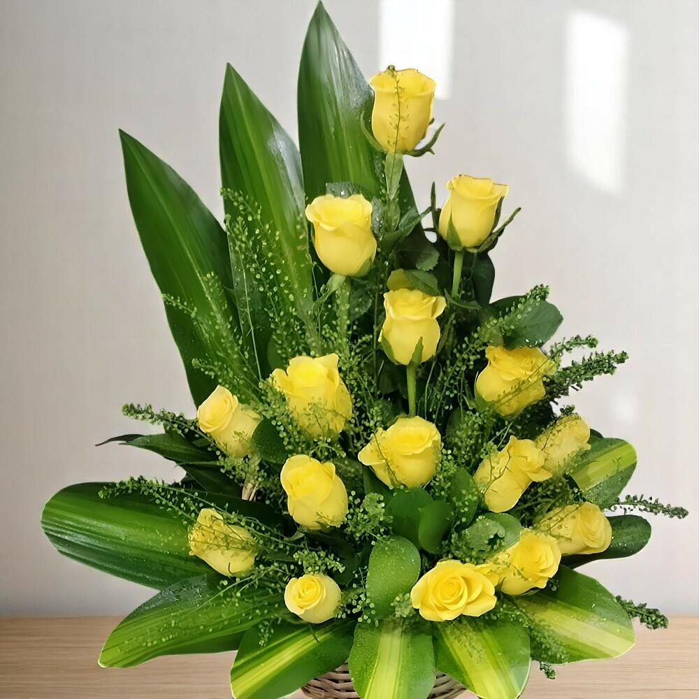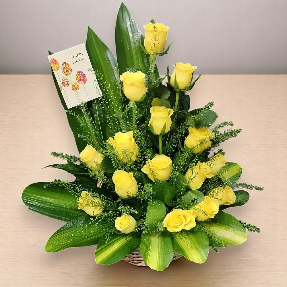 Cesta especial para Pascua con rosas amarillas rellenos hojas