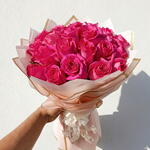 Este ramo presenta un abundante ramillete de vibrantes rosas color fucsia, cuidadosamente dispuestas en capas de envoltura blanca translúcida y rosa empolvado, rematadas con un lazo decorativo color marfil. Las flores exuberantes y saturadas y el envoltorio moderno lo convierten en una opción llamativa para cumpleaños, aniversarios o gestos románticos, emanando lujo y audacia en cada pétalo.
