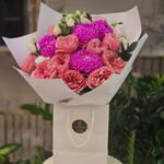 Indulge in the luxury of our Florists Specials. Featured in this stunning ensemble are exquisite Ecuadorian Pink Roses, adding an elegant touch with 10 ravishing blooms. These are beautifully complimented by the delicate 5 Deco Delister Pink blossoms, highlighting the blush of romance in this arrangement. Adding a delightful dash of purity, 4 Lisiyanthus White flowers have also gracefully wrapped their way into this bouquet. The arrangement is perfectly balanced with 4 Single Rescus, their charm carrying the aura of a tranquil garden. Bound in a mesmerizing white wrap, presented in a tasteful flower bag, this composition is bound to become their most beloved possession.