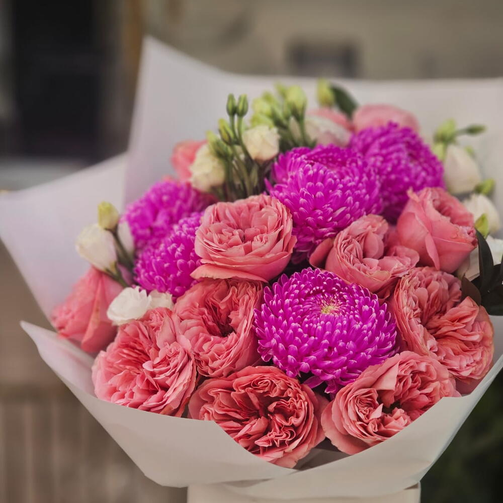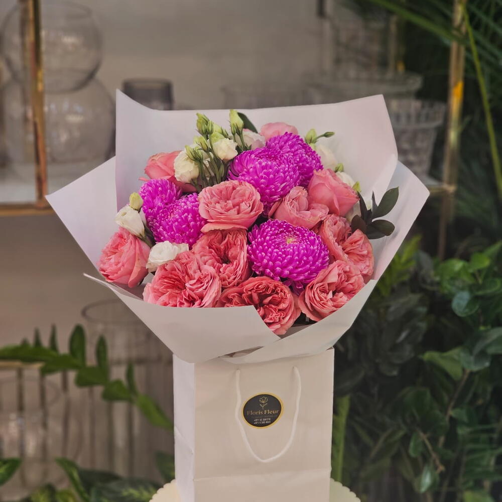 Indulge in the luxury of our Florists Specials. Featured in this stunning ensemble are exquisite Ecuadorian Pink Roses, adding an elegant touch with 10 ravishing blooms. These are beautifully complimented by the delicate 5 Deco Delister Pink blossoms, highlighting the blush of romance in this arrangement. Adding a delightful dash of purity, 4 Lisiyanthus White flowers have also gracefully wrapped their way into this bouquet. The arrangement is perfectly balanced with 4 Single Rescus, their charm carrying the aura of a tranquil garden. Bound in a mesmerizing white wrap, presented in a tasteful flower bag, this composition is bound to become their most beloved possession.