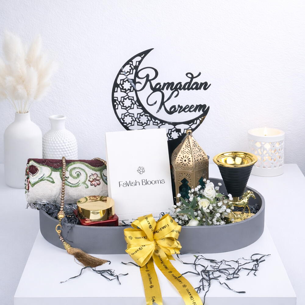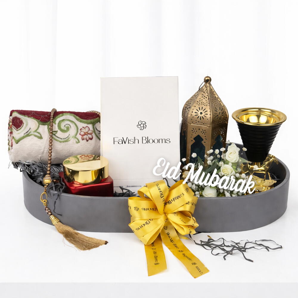 Celebra la alegría del Eid con la Cesta de regalo premium Eid Serenity, una colección refinada diseñada para reflejar elegancia, tradición y regalos pensados. Este conjunto bellamente curado incluye 100 g de dragees premium en una bolsita exclusiva de FaVish Blooms, un tapete de oración, tasbih, quemador de bakhoor con bakhoor, linterna decorativa y un delicado mini ramo de flores, rematado con un adorno “Eid Mubarak”. Todos los elementos están elegantemente dispuestos en una sofisticada bandeja de cuero con un lujoso lazo de cinta dorada en forma de flor, creando un regalo de Eid atemporal. Perfecto para: • regalos para anfitriones de Eid • regalos corporativos por Eid • Familia y seres queridos • regalos para la decoración del majlis Un regalo significativo para Eid — bellamente presentado al estilo FaVish.
