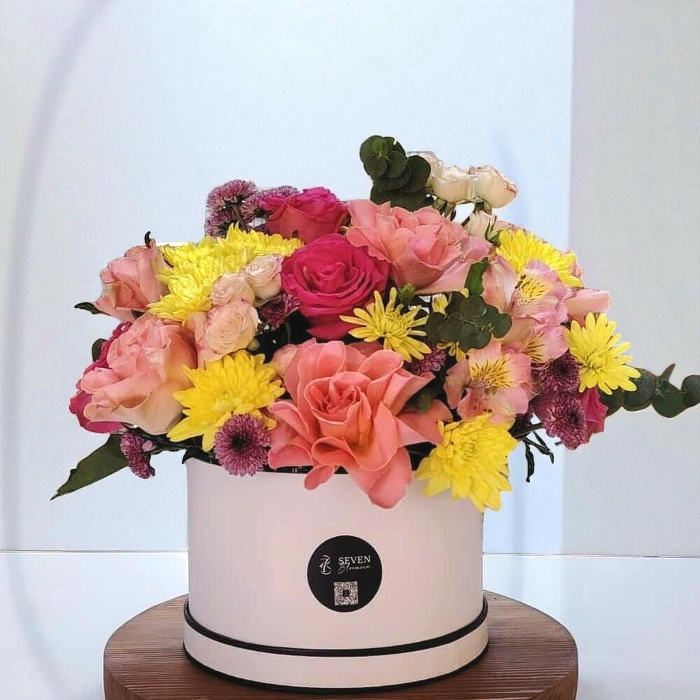 Experience the timeless elegance of our hand-picked Flowers in a Box, skillfully arranged for impeccable beauty. This ensemble includes a vibrant Eucalyptus stem, five stunning Chrysanthemums, and three delicate baby pink roses for a touch of softness. Interwoven with two sprigs of limonium and five light pink roses for a dash of charm, the composition is perfected with intense fuchsia roses. These blossoms are artistically situated in an aesthetic and classy white flower box, creating a breathtaking gift that never fails to make a lasting impression. This box is a perfect blend of sophistication and floral splendor, exclusively designed to impress.