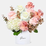 Greenery - 2 ud. Hydrangea - 2 ud. pink roses - 4 ud. rosas blancas - 3 ud. café con leche - 4 ud.