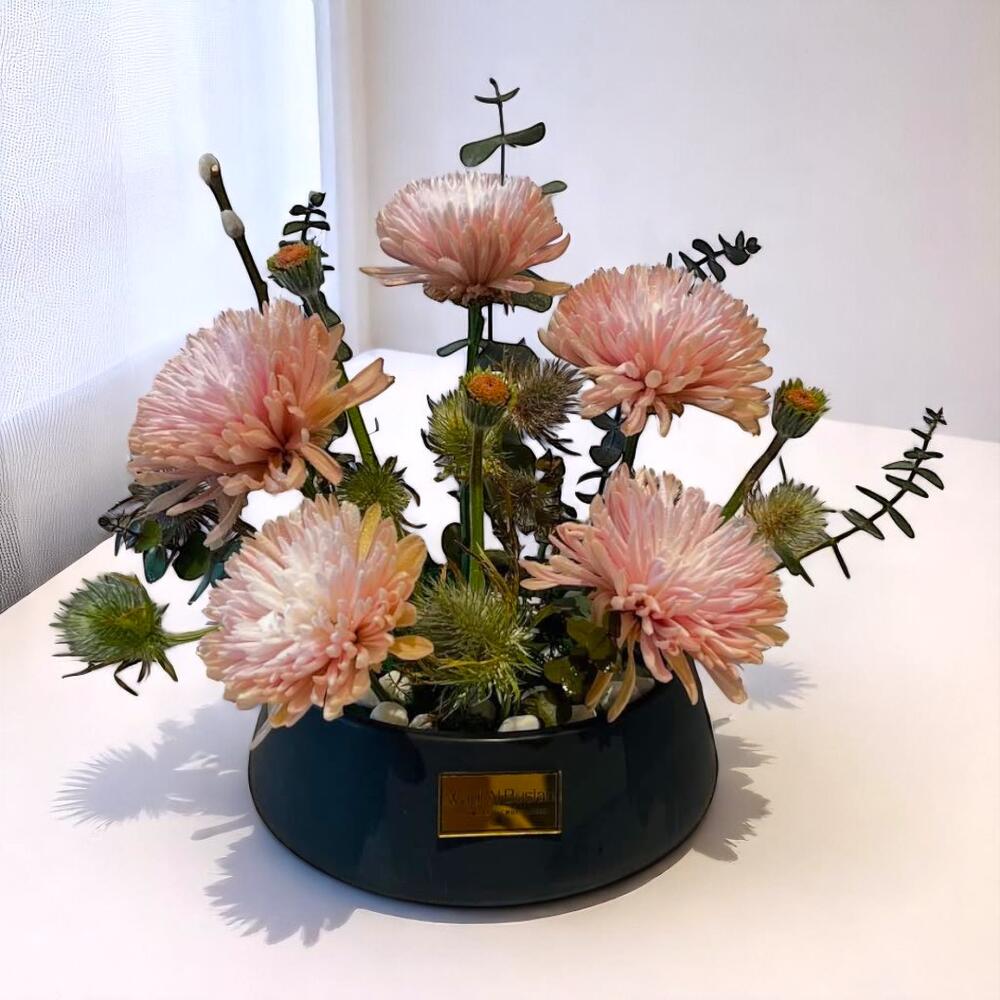 Presentamos la Elegante Caja Floral de Crisantemos Rosas, un refinado arreglo de mesa con delicados crisantemos rosados combinados con exóticos cardos y ramitas de eucalipto fresco. Diseñada con una lujosa base de cerámica negra, esta moderna pieza floral es perfecta para una decoración elegante del hogar, entornos profesionales o un regalo especial. Con una estética minimalista pero sofisticada, combina textura, tono y elegancia natural en un ramo cuidadosamente seleccionado. Instrucciones de cuidado: Mantenga el arreglo en un lugar fresco y sombreado, alejado de la luz solar directa y del aire acondicionado. Rocíe ligeramente las flores a diario para mantener su frescura y revise el nivel de agua dentro de la espuma floral cada 1 o 2 días. Rellene con agua limpia según sea necesario para mantener los tallos hidratados y la composición vibrante.