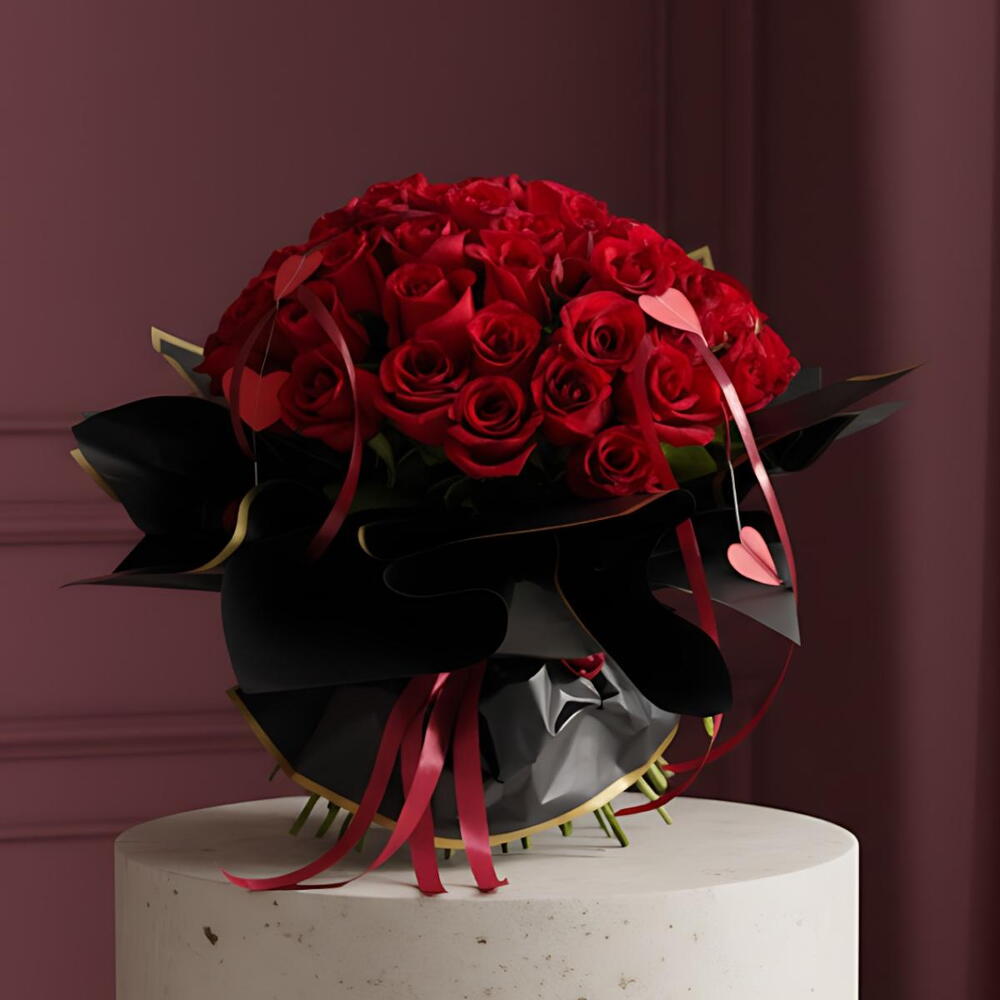 Una expresión audaz y apasionada de amor, este ramo atado a mano presenta 55 rosas rojas frescas, realzadas con detalles en forma de corazón. Envuelto elegantemente en negro, es un regalo dramático e inolvidable para cualquier ocasión romántica.